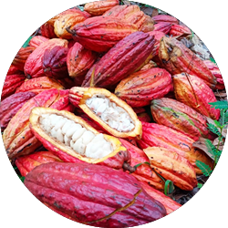 Semillas grandes, color chocolate o purpúreo, de 2 a 3 cm de largo y de sabor amargo. El cacao cuenta con un alto índice de grasas (sobre todo saturadas, y en menor medida, monoinsaturadas y poliinsaturadas), hidratos de carbono y proteínas, también contiene magnesio, fósforo, potasio, teobromina, cafeína, antioxidantes y agua, entre otros.